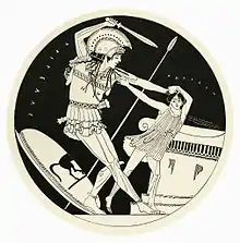 Después de un tiempo, Atenea hace que Ájax recupere la razón, y este se avergüenza terriblemente de los crímenes que ha cometido. Entonces el héroe, después de invocar la ayuda de los dioses y maldecir una vez más a sus compatriotas y en particular a Agamenón y Odiseo, planta su espada en la tierra con la punta apuntando hacia arriba y se arroja sobre ella haciéndola penetrar por la axila, su único punto vulnerable.