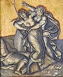 El alma de Menipo de Gadara se encuentra con el maldito Tántalo, quien es obligado por Zeus a sufrir hambre y sed, aunque no la tenga, impidiéndole refrescarse y beber. Movido por la curiosidad por saber si los dioses realmente conocían todas las acciones de los mortales, un día les sirvió la carne de su hijo Pélope. Todos los dioses, excepto Deméter, que estaba entristecida por la desaparición de su hija Perséfone, obviamente rechazaron el banquete sacrílego y, habiendo resucitado a Pélope, reemplazaron su hombro (comido por Deméter) por uno de marfil. Otros autores antiguos, como Píndaro, rechazan este tipo de delito creyendo que, en cambio, su hijo Pélope fue secuestrado por Posidón, dios del mar, preso de la pasión y que había sido llevado por él al Olimpo para ser su copero. A pesar de todas las ofensas contra los dioses, Tántalo, después de la muerte, fue arrojado al Hades donde, en memoria eterna de su crimen, no podía comer ni beber, a pesar de estar rodeado de comida y agua. Tántalo, de hecho, estaba atado a un árbol frutal cargado de frutas de todas las cualidades, incluidas peras y manzanas brillantes, en medio de un lago cuyo agua le llegaba hasta la barbilla. Pero tan pronto como Tántalo trató de beber, el lago se secó, y tan pronto como intentó tomar una fruta, las ramas se alejaron, o un repentino soplo de viento las hizo volar lejos de sus manos.[6]