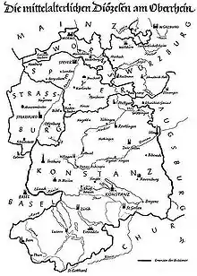 A partir de la época merovingia, y luego de la carolingia, los confines de la diócesis, con la ocupación de territorios sobre la orilla derecha del río Rin, estaban compuestos así: al norte con la diócesis de Worms; al este con las de Würzburg y de Augusta, al sur con las diócesis de Costanza y de Estrasburgo, y finalmente, al oeste con la de Metz.[4]