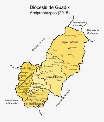 La diócesis comprende la parte noreste de la provincia de Granada. En el obispado de Ignacio Noguer Carmona (1979), se organizó en siete arciprestazgos: La Sagra, Jabalcón, Baza, Guadix, Fardes, Marquesado y Los Montes, sumando un total de 107 parroquias. En 2015 el obispo Ginés García Beltrán reorganizó las 74 parroquias de la diócesis en cinco arciprestazgos según las siguientes tablas: