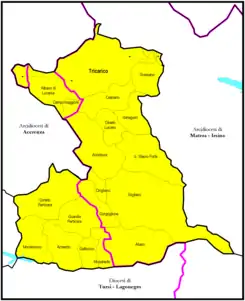 La diócesis de Tricarico se extiende por unos 1237 km² y se divide en 32 parroquias, agrupadas en dos zonas pastorales. El territorio comprende 19 municipios de las provincias civiles de Matera y Potenza, en Italia. De Matera, forman parte de la diócesis, los municipios de Accettura, Aliano, Calciano, Cirigliano, Garaguso, Gorgoglione, Grassano, Oliveto Lucano, San Mauro Forte, Stigliano y Tricarico; mientras que de Potenza, forman parte del territorio diocesano, los municipios de Albano di Lucania, Armento, Campomaggiore, Corleto Perticara, Gallicchio, Guardia Perticara, Missanello y Montemurro.[2]
