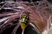 Mide de 5.0 a 5.3 mm. Los élitros tienen bandas transversas verdes y amarillas, aunque hay gran variedad y a veces el diseño está ausente.[2]