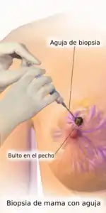 La biopsia permite realizar un diagnóstico definitivo de cáncer de mama. Para realizar la biopsia, se utiliza una aguja especial guiada por radiografía u otra técnica de diagnóstico por imágenes para extraer una porción muy pequeña de tejido de la zona sospechosa. A menudo el especialista coloca un pequeño marcador metálico dentro de la mama para poder identificar la zona más fácilmente en futuras pruebas de diagnóstico por imágene.