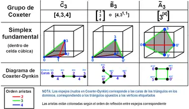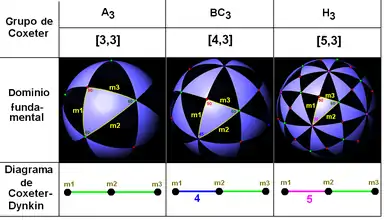 ![]() Grupos de Coxeter en el espacio 3d con sus diagramas. Los espejos (caras triangulares) están etiquetados por el vértice opuesto 0..3. Las ramas se colorean por su orden de reflexión. llena 1/48 del cubo. llena 1/24 del cubo. llena 1/12 del cubo. |