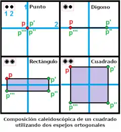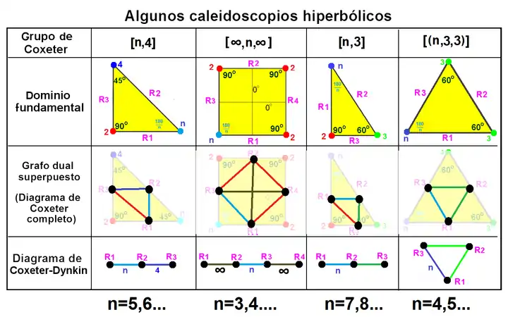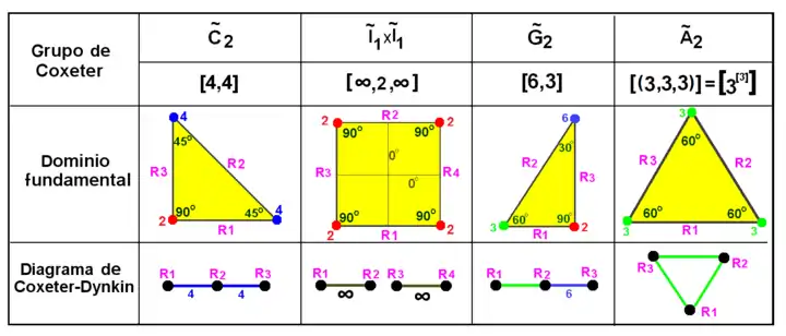 ![]() Grupos de Coxeter en el plano euclídeo con sus diagramas equivalentes. Las reflexiones se etiquetan como nodos gráficos R1, R2, etc. y se colorean por su orden de reflexión. Las reflexiones a 90 grados están inactivas y, por lo tanto, se suprimen del diagrama. Las simetrías especulares paralelas están conectadas por una rama etiquetada con ∞. El grupo prismático x se muestra como una duplicación de , pero también se puede crear en forma de dominios rectangulares al duplicar los triángulos . es una duplicación del triángulo . | |
