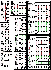 - Se utilizan indistintamente tres simbologías diferentes para definir los mismos grupos: como una letra/número, como un conjunto de números entre corchetes y como el diagrama de Coxeter.