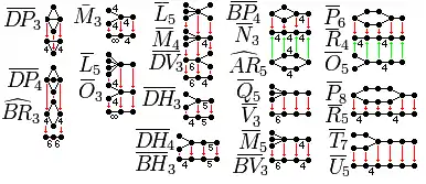 - Véase también familias de politopos para obtener una tabla de los politopos uniformes de nodo final asociados con estos grupos.
