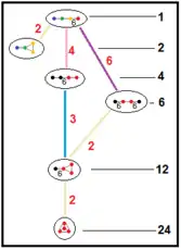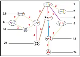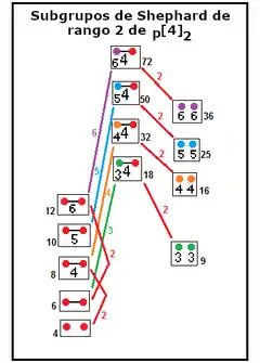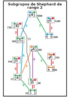 ![]() Los 12 grupos de Shephard irreducibles con los índices de sus subgrupos relacionados.[33] El índice 2 de subgrupos se relaciona eliminando una reflexión real: p[2q]2 --> p[q]p, índice 2. p[4]q --> p[q]p, índice q. |