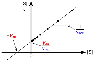 La representación gráfica de Hanes permite identificar el Km y Vmax; el punto de corte con el eje de ordenadas es el equivalente a Km/Vmax, y el de abscisas es el valor de −Km.