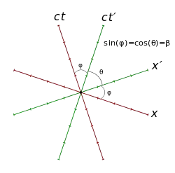 Sin embargo, resulta que, al dibujar un diagrama tan simétrico, es posible deducir las relaciones del diagrama incluso sin mencionar el marco mediano y el ángulo β0 en absoluto. En su lugar, la velocidad relativa β = vc entre S y S′ se puede determinar directamente según la siguiente construcción, proporcionando el mismo resultado:[14] Si φ es el ángulo entre los ejes de ct′ y ct (o entre x y x′), y θ entre los ejes de x′ y ct′, se tiene que:[14][15][16][17]
