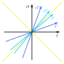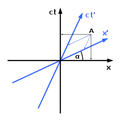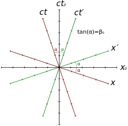 Si se asigna ct en lugar de t en los ejes de tiempo, el ángulo α entre los ejes de x y x′ será idéntico al de los ejes de tiempo ct y ct′. Esto se desprende del segundo postulado de la relatividad especial, que dice que la velocidad de la luz es la misma para todos los observadores, independientemente de su movimiento relativo (véase más adelante). El ángulo α viene dado por:[7]