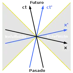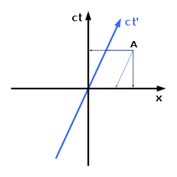 Esta línea azul etiquetada como ct′ puede interpretarse como el eje del tiempo para el segundo observador. Junto con el eje x, que es idéntico para ambos observadores, representa su sistema de coordenadas. Dado que los marcos de referencia están en configuración estándar, ambos observadores están de acuerdo con la ubicación del origen de sus sistemas de coordenadas. Los ejes para el observador en movimiento no son perpendiculares entre sí y la escala en su eje de tiempo se estira. Para determinar las coordenadas de un determinado evento, se deben construir dos líneas, cada una paralela a uno de los dos ejes, pasando por el evento, y se leen sus intersecciones con los ejes.