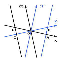 La traslación correspondiente de x y t a x′ y t′ y viceversa se describe matemáticamente mediante la transformación de Lorentz, que es . En el eje x′, t′ = 0, entonces . Esto implica que la pendiente de x′ es . Independientemente de los ejes de espacio y tiempo que surjan a través de dicha transformación, en un diagrama de Minkowski corresponden a los diámetros conjugados de un par de hipérbolas. Las escalas en los ejes se proporcionan de la siguiente manera: si U es la longitud de la unidad en los ejes de ct y x respectivamente, la longitud de la unidad en los ejes de ct′ y x′ es:[8]