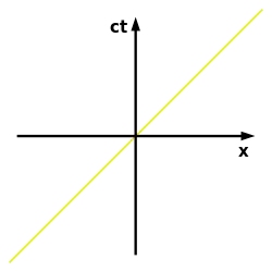 Los ejes negros etiquetados como x y ct en el diagrama adjunto son el sistema de coordenadas de un observador, denominado en reposo, y que está ubicado en x = 0. La línea del universo de este observador es idéntica al eje de tiempo ct. Cada línea paralela a este eje correspondería también a un objeto en reposo pero en otra posición. La línea azul describe un elemento que se mueve con velocidad constante v hacia la derecha, como podría ser un observador en movimiento.