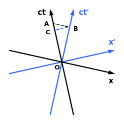 Se supone que el observador cuyo marco de referencia está dado por los ejes negros se mueve desde el origen O hacia A. El reloj en movimiento tiene el marco de referencia dado por los ejes azules y se mueve de O a B. Para el observador negro, todos los eventos que suceden simultáneamente con el evento en A se ubican en una línea recta paralela a su eje espacial. Esta línea pasa a través de A y B, por lo que A y B son simultáneos desde el marco de referencia del observador con ejes negros. Sin embargo, el reloj que se mueve en relación con el observador negro marca el tiempo del evento en el eje de tiempo azul. Esto está representado por la distancia de O a B. Por lo tanto, el observador en A con los ejes negros nota que su reloj marca el lapso de O a A mientras observa que el reloj se mueve en relación con él para leer la distancia de O a B, debido a que la distancia de O a B es más pequeña que la de O a A, y concluyen que el tiempo que transcurre en el reloj que se mueve en relación con ellos es menor que el que transcurrió en su propio reloj.