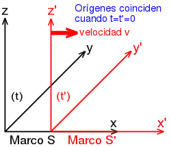 - La posición de los orígenes de los marcos S y S' coincide para el tiempo t=0 en el cuadro S y t′=0 en el cuadro S′.[2]: 107
