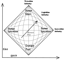 - las coordenadas del mismo se extienden hasta infinito. Esto puede solventarse sustituyendo el espaciotiempo físico por un espaciotiempo no físico (nuestro diagrama) conforme con el primero.