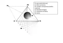 Interactuando entre ellas las primeras tres dimensiones generan la configuración discursiva (y en consecuencia aquel específico uso de “elementos” discursivos que definen una identidad dialógica); están representadas por la polaridad “personalis”, por la polaridad “alter” y por la polaridad del “propter omnia/omnes”[2]. La polaridad “personalis” (llamada también del “informe” o de la “auto atribución”) genera y al mismo tiempo ocupa el espacio discursivo con referencia a producciones discursivas que se caracterizan por el uso en primera persona singular y plural (ej. “Yo” y “Nosotros”; “El” y “Ellos”), moviéndose en una dimensión auto atributiva en términos actuales (ej. “Yo/Nosotros soy/somos”), retrospectivos (ej. “Yo/Ellos era/eran”), y anticipatorios (ej. “Yo/Ellos seré/serán”). El precipitado gramatical que ve la individualización de la primera y tercera persona del singular y plural (yo, él, nosotros y ellos) en correspondencia con la polaridad personalis es particular de la lengua italiana; cuando se tomara como referencia otra lengua, como la lengua de idiogramas, las polaridades resultan ser similares-análogas pero representadas en referencia a otras unidades simbólicas propias de tal codificación. La polaridad “alter” (llamada también de la “narración” o de la “hetero atribución”) define todas aquellas producciones discursivas que en la declinación de la lengua italiana, se refieren a la segunda persona singular plural (Tú y Vosotros) y que expresan un sentido que mueve hacia algo, atribuyendo al exterior (exterior a la polaridad) configuraciones de sentido que se acomodan sobre algo que está ya presente (que se ha vuelto ya disponible en el proceso dialógico). La forma de la narración organiza el discurso en torno a la dimensión hetero atributiva, es decir atribuciones “externas” en términos actuales (ej. “Tú eres”), retrospectivos (ej. “Vosotros erais”), y anticipatorios (ej. “Tú serás”). La tercera polaridad es denominada “propter omnia/omnes” (llamada también “matriz colectiva”) y está constituida por todas las producciones discursivas que el sentido común, en un dado momento discursivo, vuelve disponibles antes aún de que sean empleadas (es decir antes que encuentren empleo en términos de forma “personalis” o “alter”. Esta polaridad “depósito” es necesaria, en términos teóricos, para la definición de las otras dos, en cuanto el lenguaje natural ofrece potencialmente todas aquellas posibilidades que pueden ser luego declinadas en personalis y en alter.