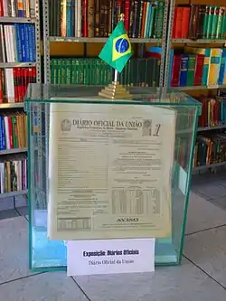El Diario Oficial fue creado por medio de la Ley Imperial N° 1.177, sancionada por el emperador Pedro II, el 9 de septiembre de 1862 y el primer número circuló el 1 de octubre de 1862, cuando el gobierno brasileño, a través de una deliberación del Marqués de Olinda, pasa a divulgar los actos legales a través del Diario Oficial.[1]