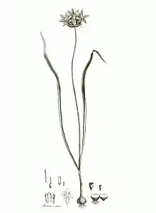 Su escapo delgado y sin hojas remata en una inflorescencia que lleva de seis a 15 flores densamente agrupadas, en tonos de púrpura brillante y con una longitud de 1 cm.