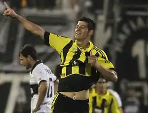 ![]() Centurión celebrando un gol con el Club Guaraní, en 2012. | |||