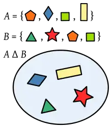 En teoría de conjuntos, la diferencia simétrica de dos conjuntos es una operación cuyo resultado es otro conjunto que contiene a aquellos elementos que pertenecen a uno de los conjuntos iniciales, pero no a ambos a la vez. Por ejemplo, la diferencia simétrica del conjunto de los números pares positivos P y el conjunto de los cuadrados perfectos C es un conjunto D que contiene los cuadrados impares y los pares no cuadrados: