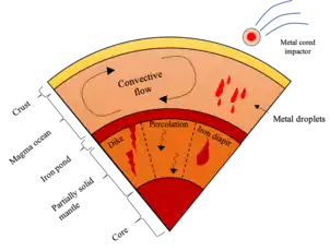 Los modelos de temperatura predicen la fusión de la aleación de hierro diseminada mientras que las rocas de silicato se ablandan en el nivel superior. La fuente de calor es la desintegración radiactiva. El hierro líquido migró hacia abajo a niveles donde las temperaturas más frías mantenían los silicatos solidificados, formando una capa de hierro en la parte superior de un núcleo de material indiferenciado, y debajo del manto primordial en el que se desarrolla el flujo de convección inducido por el impacto. A partir de esta etapa, las agregaciones de hierro desencadenadas por las inestabilidades de Rayleigh-Taylor migraron a través del núcleo primordial en un proceso a largo plazo (cientos de millones de años).[2][11]
