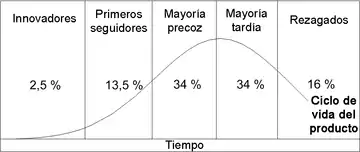 - La teoría de difusión de las innovaciones de Everett M. Rogers - para una categoría de producto dada, hay cinco categorías de compradores clasificados por su rapidez en adquirirlo cuando sale al mercado. La curva de teoría de la difusión es el fundamento teórico del Ciclo de vida del producto; esta curva la tiene forma de una campana de Gauss.