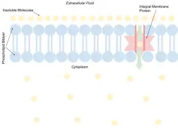 Las moléculas polares y los iones grandes disueltos en agua no pueden difundirse libremente a través de la membrana plasmática debido a la naturaleza hidrófoba de las colas de ácidos grasos de los fosfolípidos que componen la bicapa lipídica. Solo las moléculas pequeñas no polares, como el oxígeno y el dióxido de carbono, pueden difundirse fácilmente a través de la membrana. Por lo tanto, las moléculas polares pequeñas son transportadas por proteínas en forma de canales transmembrana. Estos canales están cerrados, lo que significa que se abren y cierran y, en consecuencia, desregulan el flujo de iones o pequeñas moléculas polares a través de las membranas, a veces en contra del gradiente osmótico. Las moléculas más grandes son transportadas por proteínas transportadoras transmembrana, como las permeasas, que cambian su conformación a medida que las moléculas son transportadas (por ejemplo, la glucosa o los aminoácidos). Las moléculas no polares, como el retinol o los lípidos, son poco solubles en agua. Se transportan a través de los compartimentos acuosos de las células o a través del espacio extracelular mediante transportadores solubles en agua (por ejemplo, la proteína de unión al retinol). Los metabolitos no se alteran porque no se requiere energía para la difusión facilitada. Solo la permeasa cambia de forma para transportar metabolitos. La forma de transporte a través de una membrana celular en la que se modifica un metabolito se denomina transporte de translocación de grupo.