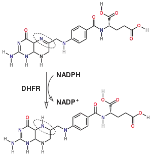 La dihidrofolato reductasa o DHFR es una enzima que reduce el ácido dihidrofólico a ácido tetrahidrofólico, utilizando NADPH como donador de electrones, que puede ser convertido a los diversos cofactores tipo tetrahidrofolato usados en química de transferencia de 1 carbono. En humanos, la enzima DHFR está codificada por el gen dhfr.[1][2][3]