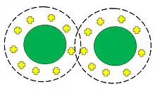 Las suspensiones de partículas cargadas de manera similar dispersas en un electrolito líquido se estabilizan mediante un efecto descrito por el modelo de doble capa de Helmholtz. El modelo tiene dos capas. La primera capa es la superficie cargada de la partícula, que crea un campo electrostático que afecta a los iones del electrolito. En respuesta, los iones crean una capa difusa de carga igual y opuesta, lo que hace que la carga superficial sea neutra. Sin embargo, la capa difusa crea un potencial que rodea a la partícula que difiere del electrolito a granel.
