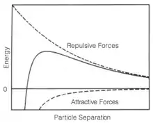La capa difusa sirve como fuerza de largo alcance para la estabilización de las partículas. Cuando las partículas se acercan entre sí, la capa difusa de una partícula se superpone con la de la otra partícula, generando una fuerza repulsiva. La siguiente ecuación proporciona la energía entre dos coloides como resultado de las interacciones de Hamaker y la repulsión electrostática.