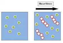Cuando se corta una solución concentrada estabilizada a una velocidad de corte relativamente baja, las interacciones repulsivas partícula-partícula mantienen las partículas en una estructura de equilibrio ordenada y en capas. Sin embargo, a velocidades de cizallamiento elevadas por encima de la velocidad de cizallamiento crítica, las fuerzas de cizallamiento que empujan las partículas juntas superan las interacciones repulsivas partícula-partícula, forzando a las partículas a salir de sus posiciones de equilibrio. Esto conduce a una estructura desordenada, lo que provoca un aumento de la viscosidad.[10]
