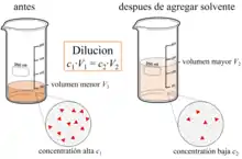 La dilución consiste en bajar la cantidad de soluto por unidad de volumen de disolución. Se logra adicionando más diluyente a la misma cantidad de soluto: se toma una poca porción de una solución alícuota y después esta misma se introduce en más disolvente.