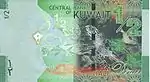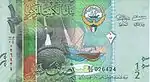 ½ Dinar | Verde | 120 x 68 mm | ½ - نصف الدينار - Kuwait Towers y una nave dhow Escudo de armas - بنك الكويت المركزي | ½- Tortuga de mar y el pez Bramidae de plata (Al Zubaidi)- |