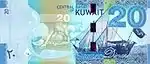 20 Dinares | Azul | 160 x 68 mm | عشرون دينار ٢٠ - Palacio Seif , y una nave dhow Escudo de armas - بنك الكويت المركزي | 20 - Buzo peruano kuwaití y Al-Boom buque dhow kuwaití tradicional |