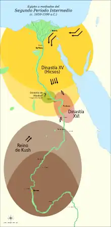 Con la derrota de las dinastías XIII y XIV —ambas contemporáneas entre sí, coincidiendo probablemente el inicio de la XIV con la etapa final de la XIII—[7] por parte de los hicsos y el establecimiento de la dinastía XV con capital en Avaris, se produjo en el sur del Alto Egipto un vacío de poder que aprovecharon los gobernantes locales —quizás emparentados con los herederos de la dinastía XIII— para formar una nueva dinastía, la XVI, con capital en Tebas.[8]