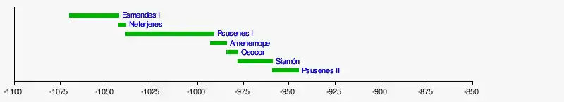 Psusenes III | Titjeperura Setepenra | Pasebajaenniut Meryamón | Posiblemente fue Psusenes II | 969-945 a. C. |