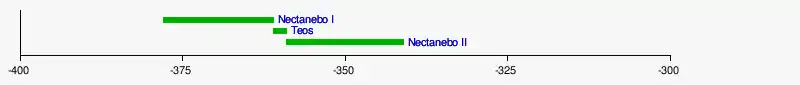 Nectanebo I consiguió el control sobre Egipto en noviembre de 380 a. C., pero pasó la mayor parte de su reinado defendiéndose de los intentos persas de reconquista, con la ocasional ayuda de Esparta o Atenas. En el año 365 a. C. Nectanebo convirtió en corregente a su hijo y heredero Teos, que tras la muerte de su padre invadió los territorios del Levante mediterráneo (actuales Siria e Israel) con cierto éxito, hasta que fue depuesto por su hijo Tjahepimu,[1] que aprovechó la impopularidad de Teos para nombrar faraón a su propio hijo, Nectanebo II. El ejército egipcio apoyó a Nectanebo, y Teos se vio obligado a refugiarse en la corte persa.[2]