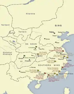 El final de la dinastía Ming comienza cuando unos rebeldes liderados por Li Zicheng capturaron la capital del imperio, Beijing. Fue entonces cuando un general Ming, Wu Sangui, pidió ayuda a los manchúes del norte, abriéndoles las puertas de la Gran Muralla, para que entrasen al imperio y les ayudasen a derrotar a los rebeldes. Efectivamente, los poderosos manchúes derrotaron a los rebeldes pero además, se hicieron con el gobierno del imperio y fundaron una nueva dinastía, la dinastía Qing.[1] Fue entonces cuando los leales a los Ming, huyeron al sur del imperio, y en Nankín nombraron emperador de la dinastía Ming del Sur a Hongguang.