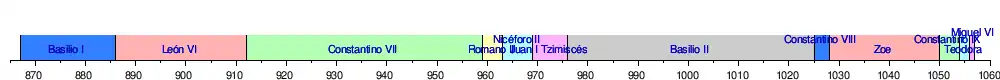 - 867-886: Basilio I (Βασίλειος Α') (811-886), casado con Eudoxia Ingerina, amante de Miguel III. Murió durante un accidente de caza.