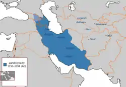 ![]() La dinastía zand en su cenit bajo Karim Khan. El azul claro muestra el Reino de Kartli-Kajetia, que estaba de jure bajo el gobierno de los zand, pero de facto autónomo. Límites estatales actuales superpuestos en naranja para comparación. | |||||||||||||||||||||||||||||||||