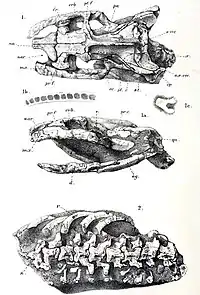 ![]() Ilustración del cráneo y la columna vertebral de Dinilysia patagonica. | ||