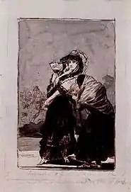 El primer estudio a la aguada de tinta china, el número 6 del Álbum B, tiene las dos figuras principales bien definidas. El segundo estudio lleva el letrero a lápiz: Se avergüenza de que su madre le hable en público y le dice «perdone VM. por Dios» y desaparecen las figuras de fondo del primer estudio. En el primer dibujo la anciana solo llevaba rosario, a partir del segundo lleva rosario y bastón.[4]