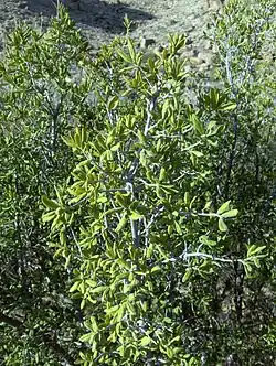 Las hojas esclerófilas[5] son obovadas, de color verde oscuro, de 2-5 cm de largo y 1-3 cm de ancho. Los ápices son obtusos a emarginados. Las superficies superiores son brillantes, mientras que las superficies inferiores están cubiertas de finos pelos y carecen de glándulas basilaminares. Las hojas están unidas a peciolos de 0,1-0,5 cm.[6] Los árboles son de hoja caduca en el norte de su área de distribución y se convierten en árboles de hoja perenne, más al sur.[5]