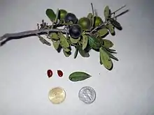 El fruto de D. texana es una baya comestible, negra y subglobosa, con un diámetro de 1.5 a 2.5 cm que madura en agosto.[6] Las bayas contienen entre tres y ocho[9] semillas triangulares de color rojo claro, de alrededor de 0,8 cm de longitud.[6]