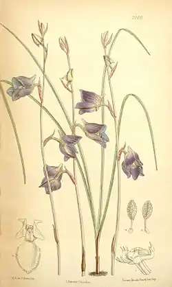 Es una planta delicada, con aspecto de hierba, con unas cuantas hojas suaves, la inflorescencia con unas pocas flores, generalmente de color azul, con pétalos ovalados y labelo falcado.