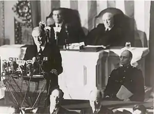 La misma tarde del 7 de diciembre el gabinete del presidente comenzó a preparar el contenido del discurso que Roosevelt iba a pronunciar al día siguiente ante los miembros del Senado y de la Cámara de Representantes reunidos en sesión conjunta. El secretario de Estado Codell Hull sugirió que en el mismo se hiciera una relación completa de todas las violaciones del derecho internacional cometidas por el Imperio de Japón en los últimos años. Pero Rossevelt pidió que fuera un discurso corto que no rebasara las quinientas palabras y que se centrara en el mensaje esencial para que llegara al mayor número posible de ciudadanos norteamericanos: que Estados Unidos había sido atacado por Japón por sorpresa y sin una previa declaración de guerra y que Estados Unidos estaba dispuesto a derrotarlo costase lo que costase.[13]