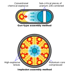 - Armas de fisión con detonación por implosión: una masa fisible de cualquier material (U-235, Pu-239 o una combinación) es rodeada por explosivos de gran potencia que al explotar comprimen la masa, resultando en una masa crítica. El método de implosión puede usar uranio o plutonio como combustible. El método de cañón solo usa uranio. El plutonio se considera como poco práctico para el método de cañón a causa del disparo prematuro debido a la contaminación con Pu-240 ya que su constante de tiempo para la fisión casi crítica es mucho más pequeña que la del U-235.