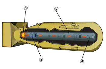 - Las armas termonucleares o bombas de hidrógeno son esencialmente una cadena de armas de fisión intensificadas por fusión (no confundir con las armas de fisión mejoradas por fusión mencionadas en el punto anterior), normalmente con dos etapas en la cadena. La segunda etapa, llamada la "secundaria", es implosionada por la energía de los rayos-x de la primera etapa, llamada la "primaria". Consecuentemente, la secundaria puede ser mucho más poderosa que la primaria, sin ser más grande. La secundaria puede ser diseñada para maximizar la liberación de energía de la fusión, pero en la mayor parte de los diseños de fusión es solo empleada para sostener o mejorar la fisión, como lo es en la primaria. Se podrían agregar más etapas, pero el resultado sería un arma de gran potencia pero demasiado poderosa para servir a algún propósito plausible.[2] Estados Unidos desplegó brevemente una bomba de tres etapas de 25 megatones, la B41, a comienzos de 1961. También en 1961, la Unión Soviética probó, pero no desplegó, un dispositivo de tres etapas de 50 a 100 megatones, la Bomba del Zar.